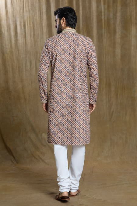 Multi color cotton kurta featuring geometric trellis print with thread work and pintucks on the neckline and cuffs. Paired with a plain art silk pyjama.