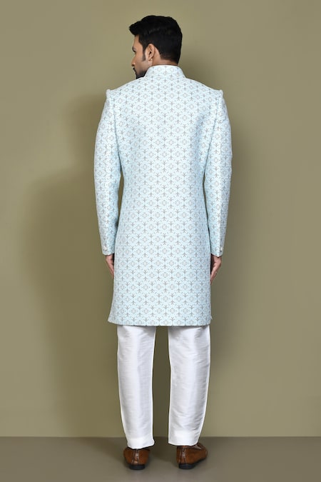 Sky blue full sleeve sherwani featuring geometric woven motifs. Paired with off-white aligadhi pant with a semi-elasticated waistband and side pockets.