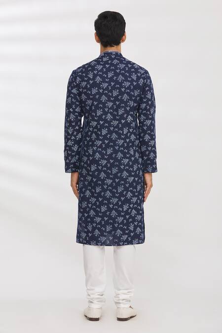 Navy blue kurta made from handloom cotton featuring floral printed motifs and an embroidered placket
