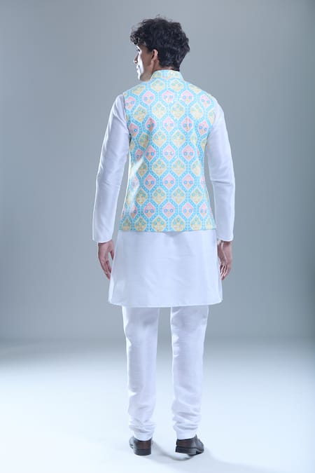 Blue Nehru jacket featuring an all-over hexagon print with front button closures