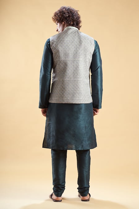 Thread embroidered geometric motifs on the jacket, Jacquard fabric texture, Dupion silk material for kurta