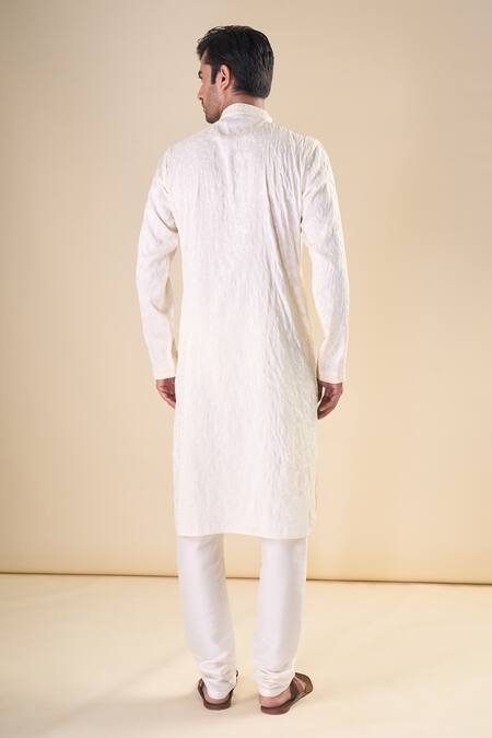 Off white silk blend straight kurta featuring thread and sequin embroidered leafy motifs. Paired with a coordinating solid pyjama.