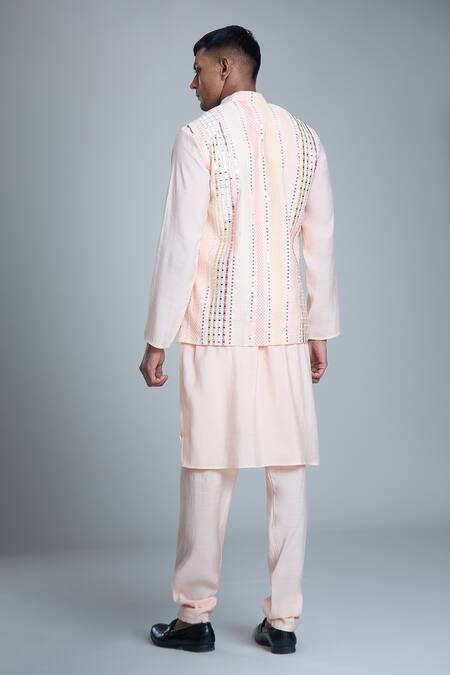 Peach bundi featuring mirror, sequin, and thread embroidery in stripe pattern. Paired with a matching kurta and pyjama.
