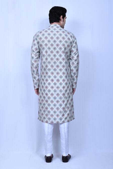 Sea green kurta featuring mughal floral pattern embroidery with a band collar. Paired with a white pant for a complete look.