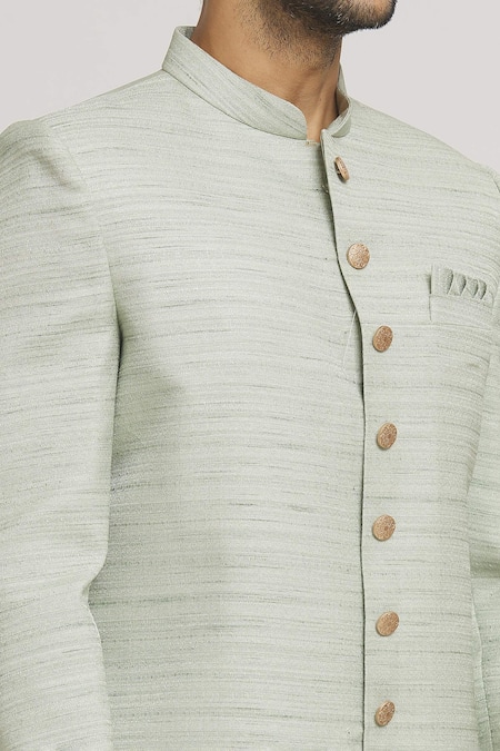 Pista green self striped nawabi sherwani featuring front carved buttons and a mandarin neckline. Paired with elasticated waist cream pant.