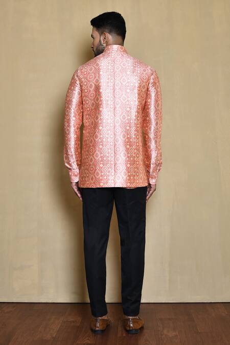 Pink bandhgala featuring ornate swirl woven details. Paired with a matching peach full sleeves short kurta and black pant.