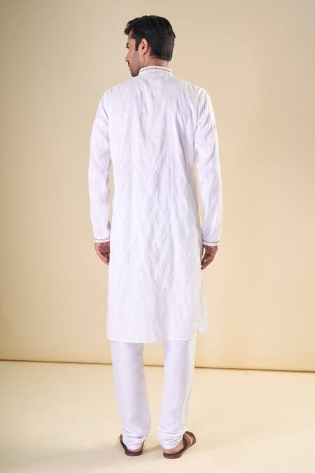 White silk blend kurta featuring thread embroidered yoke and full sleeves. Paired with solid pyjama for a coordinated look.
