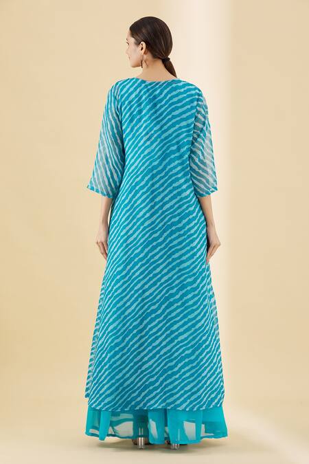 Blue long jacket with all-over leheriya print and tie up front. Comes with blue kurta.