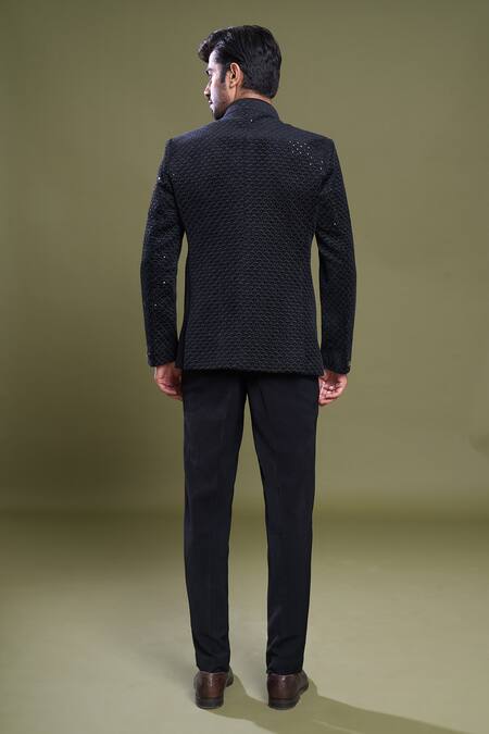 Black bandhgala featuring scallop sequin bloom embroidery and full sleeves. Paired with a matching pant made from a Japanese viscose blend.