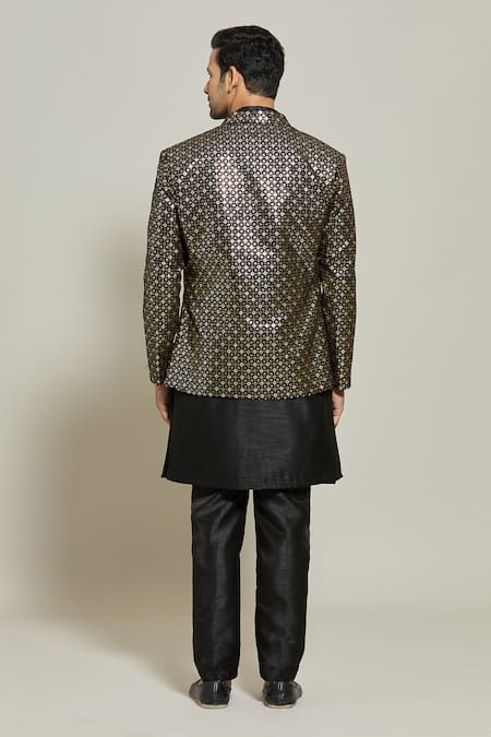 Black georgette jacket featuring all-over sequin embroidery. Paired with a blue sleeveless button-down kurta and pant made from silk blend.