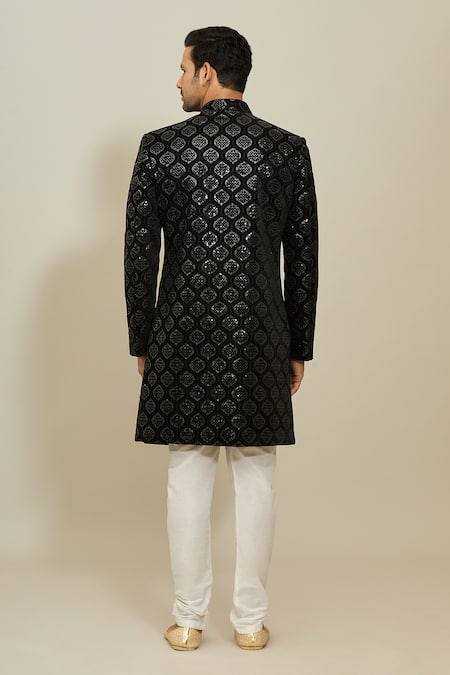 Black sherwani featuring all over Mughal ogee pattern with thread and sequin embroidery. Paired with a white churidar and dori waist.