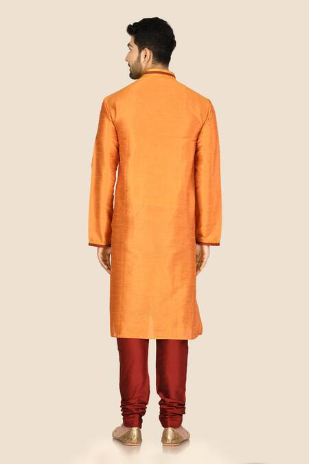 Orange kurta with and front potli button placket. Comes with maroon churidar.