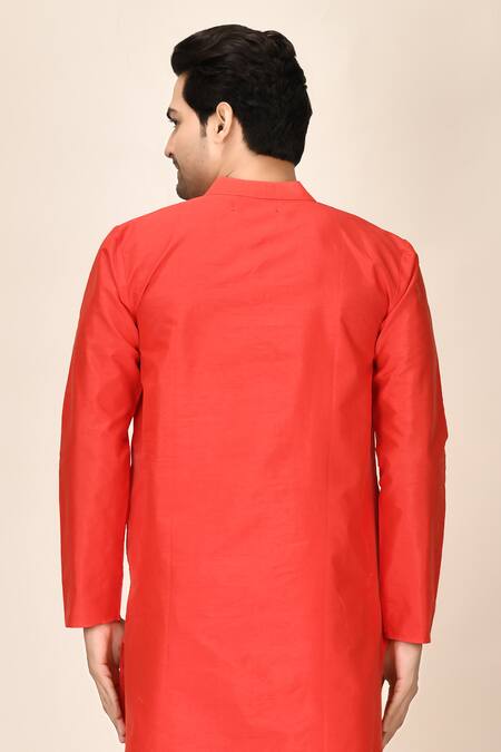 Red straight plain dupion silk kurta with front button placket.