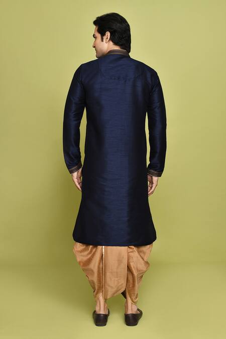 Navy blue kurta featuring embroidered swirl motifs embellished with sequins. Paired with a coordinating dhoti pant for a complete look.