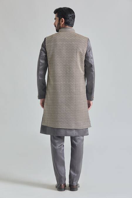 Grey sherwani jacket featuring all-over teardrop bloom embroidery. Paired with a full sleeves inner kurta and pant.