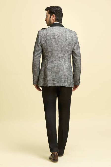 Grey tuxedo featuring full sleeves, shawl lapel collar & cutdana embellishments. Paired with a white quilted yoke shirt and pant.