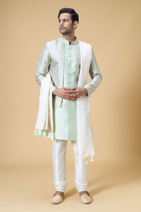 Sherwani and churidar worn by the model is not for sale.