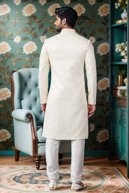 Cream sherwani featuring full sleeves and all-over tikki jaal embroidery. Paired with a churidar for a complete look.