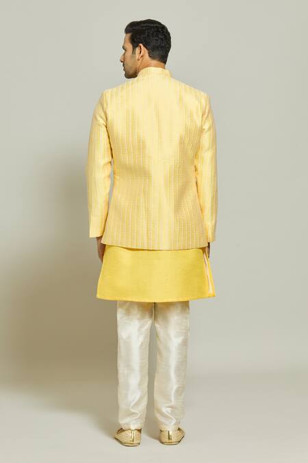 Yellow woven jacket featuring a floral stripe pattern. Paired with a plain sleeveless kurta and pant in a silk blend fabric.
