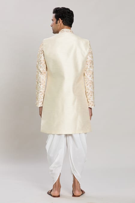 Cream kurta featuring zari embroidery in a floral vine pattern. Paired with white peshawari pant and an attached soft silk jacket.