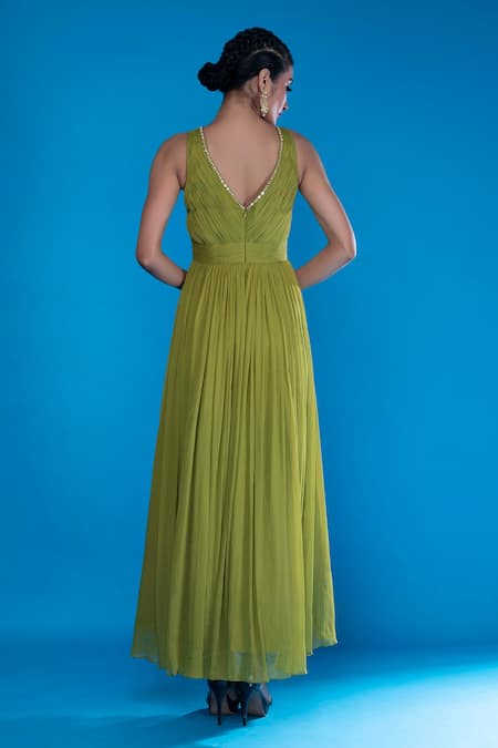Olive green gown in chiffon base fabric with ruched & embroidered yoke, front cut-out & pleated details.