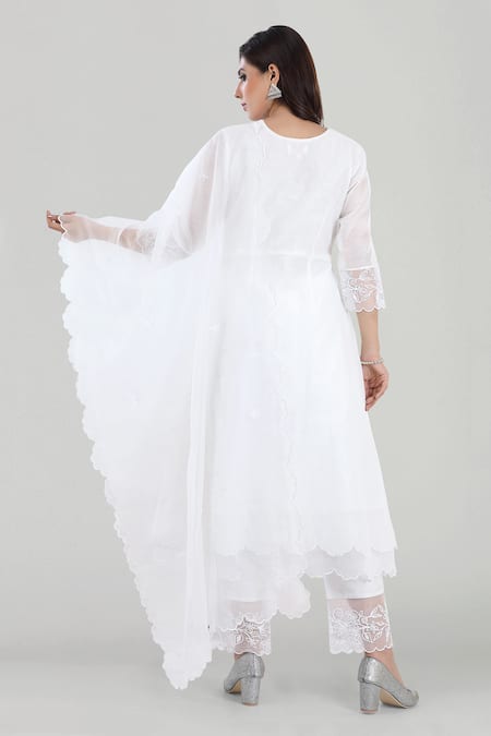White layered anarkali with embroidered yoke and round neck. Comes with straight fit pant and dupatta.