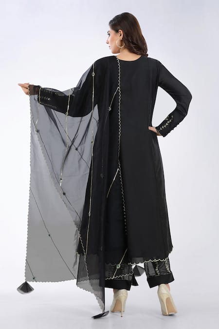 Black Anarkali Chanderi Silk, Cotton Pant Mul Cotton Dupatta Organza Set