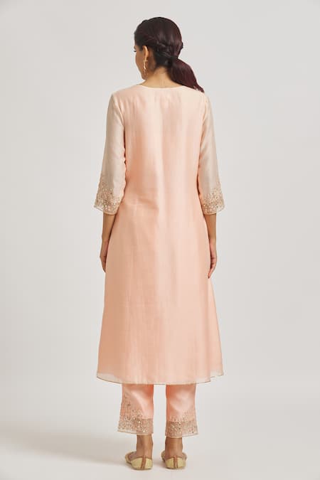Peach Organza, Chanderi, Muslin Embroidery, Mirrors Split A-line Kurta Pant Set