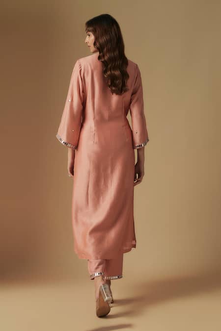 Rose gold straight kurta featuring sequin, cutdana & mirror embroidered motifs on the border. Paired with embroidered hem pant and embellished dupatta.