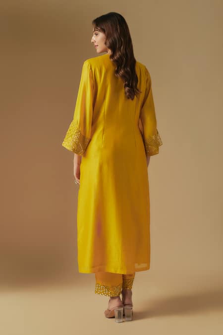 Buy_Asaga_Yellow Organza, Chanderi, Muslin Cut Work, Sequins, Zentangle Kurta Pant Set _at_Aza_Fashions
