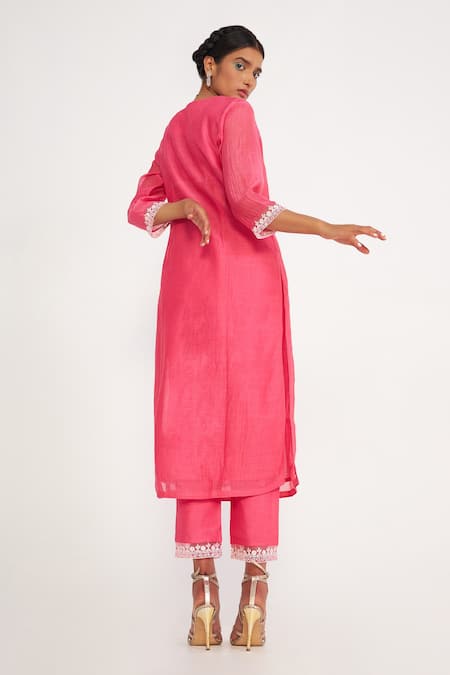 Pink Chanderi, Organza, Muslin Embroidery Round Neck Nova Floral Kurta Set