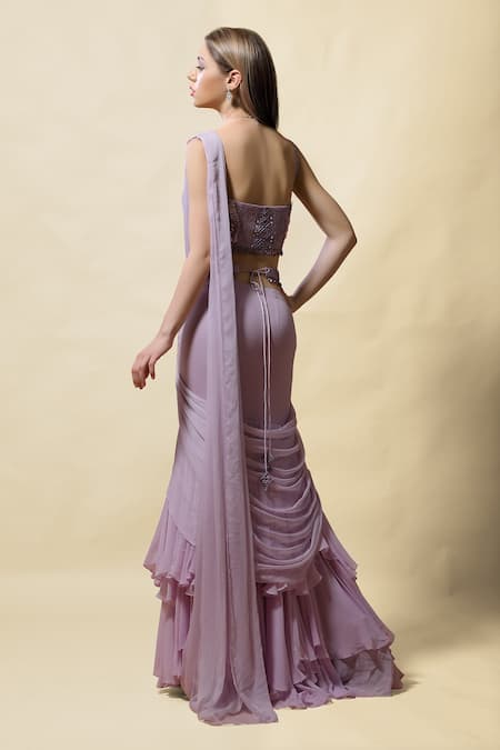 Lavender pre-draped lehenga saree with attachable pre-draped and pre-stitched pallu. Comes with embroidered blouse and belt.