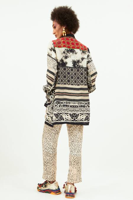 Surmai & mogra printed shirt featuring an asymmetric hem and collar neckline. Paired with abstract print trousers in a relaxed fit.