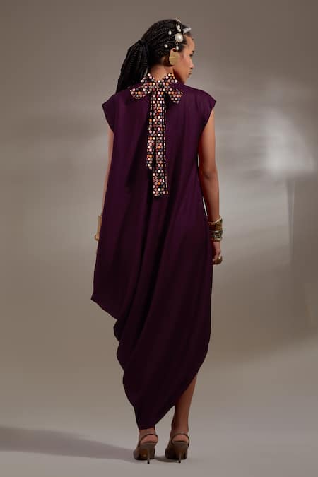 Purple Crinkle, Silk Embroidery High Neck Jamuni Rasa Drop Shoulder Dress