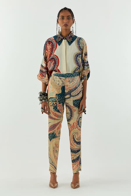 White shirt featuring ambi print, zari, and marodi embroidered collar. Paired with coordinating printed pant with side pockets.