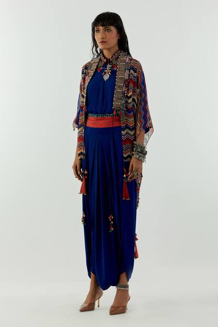 Blue Jacket-sheer Silk, Shirt And Trouser-natural Crepe Mandala Draped Trouser Set