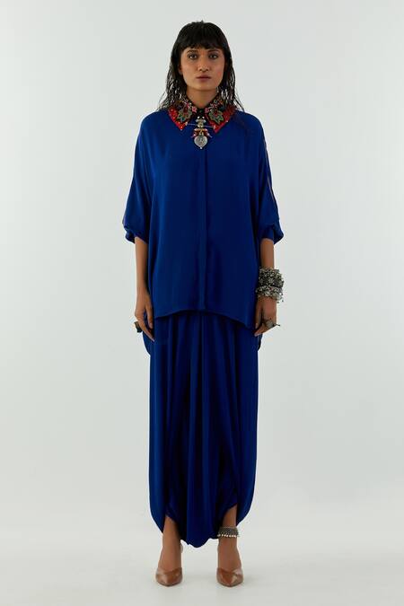 Sapphire mandala shirt with embroidered collar. Paired with drape trouser.