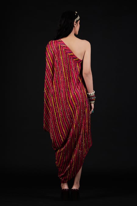 Red draped one shoulder dress, featuring multi color stripes, highlighted with sequins embellishments, along with cowry shells and tassels.