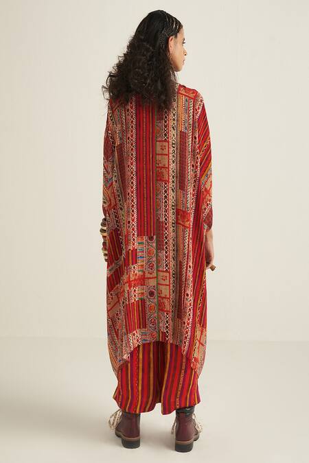 Multi colored kaftan tunic with collage prints, tribal tassel detail and seam inserts. Paired with printed narrow trouser.