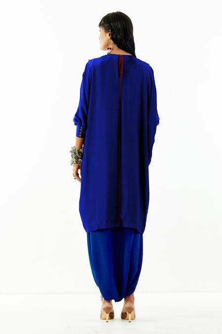 Blue Natural Crepe Zari Marodi Round Trapeze Embroidered Tunic And Trouser Set