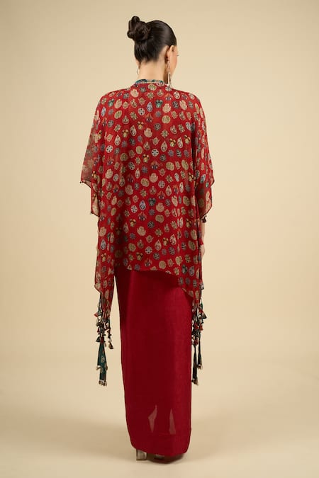 Maroon printed jacket featuring tassel embellishments and a tie-up detail. Paired with a matching blouse and skirt set.