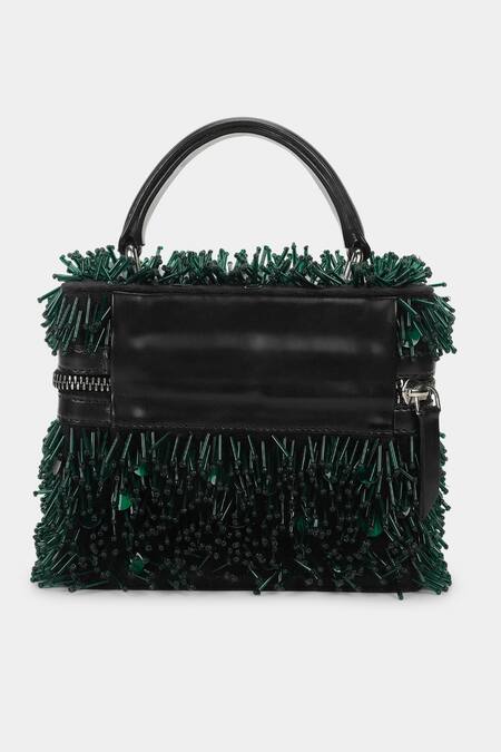 Emerald green faux leather handbag featuring structured shape and all-over glass pipes, sequins, and beads embroidery