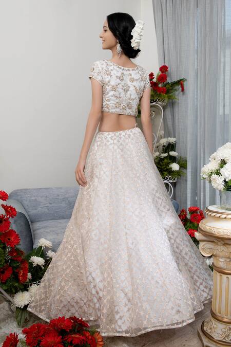 White lehenga with all-over embroidery. Paired with blouse and dupatta.