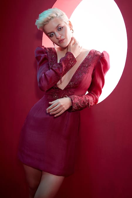 Maroon dress featuring a plunge V-neck and puff sleeves with floral motifs in sequin and bead work