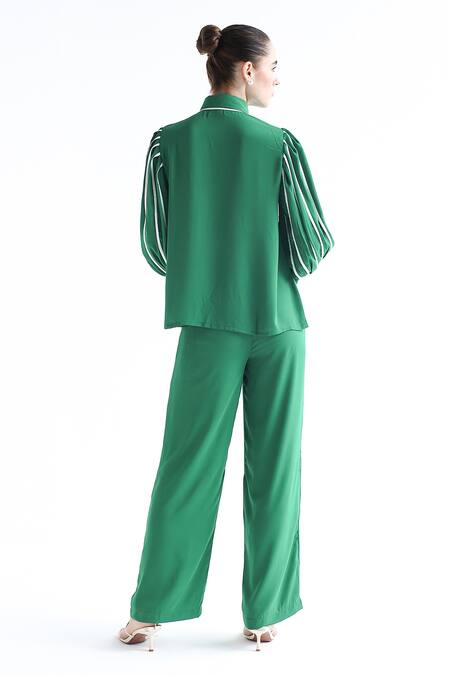 Green georgette shirt featuring a detachable neck tie on the collar and contrast pleated sleeves. Paired with matching pants that have a half elasticated waistband.