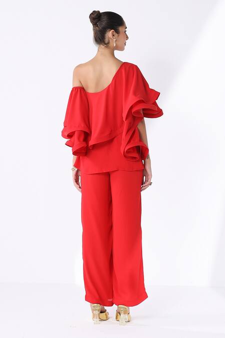Red georgette draped one-shoulder blouse featuring voluminous sleeves. Paired with matching pant with half elasticated waistband.