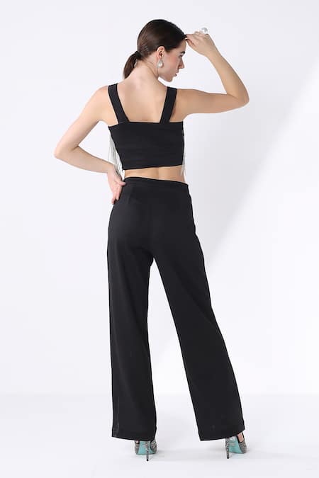 Black lycra bustier featuring a sweetheart neckline and jewel work on the neckline. Paired with wide leg pants for a complete look.