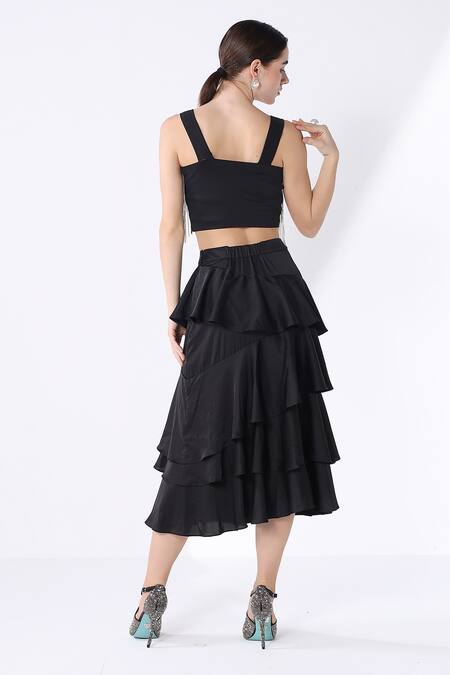 Black lycra bustier featuring jewel work on the sweetheart neckline. Paired with a satin draped ruffled skirt.
