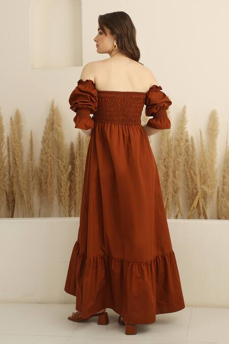 Brown Cotton One Shoulder Off Smocked Dress