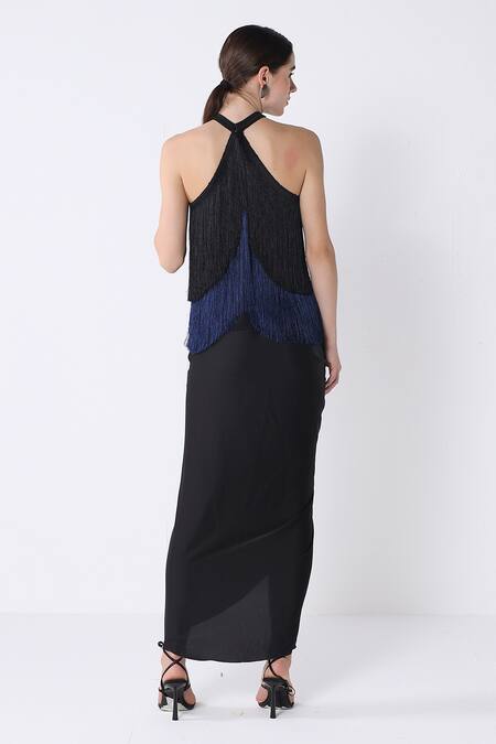 Black satin top featuring an ombre fringed pattern and a halter neckline. Accompanied by a hand-draped skirt with a side zipper closure.